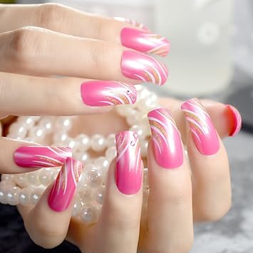 Amazon Com Coolnail Pink Rose False Nails Gold Glitter Square